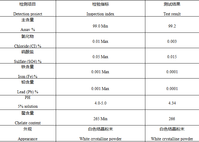 EINECS number: 205-488-0 Molecular weight: Chapter 452 EDTA properties: Not resistant to high temperatures Classification: organic sodium appearance: White crystal powder Supply capacity: 200,000 tons per year grade: Industrial grade brand: Bison port: Xingang/Qingdao Grade standards: Agricultural..... -