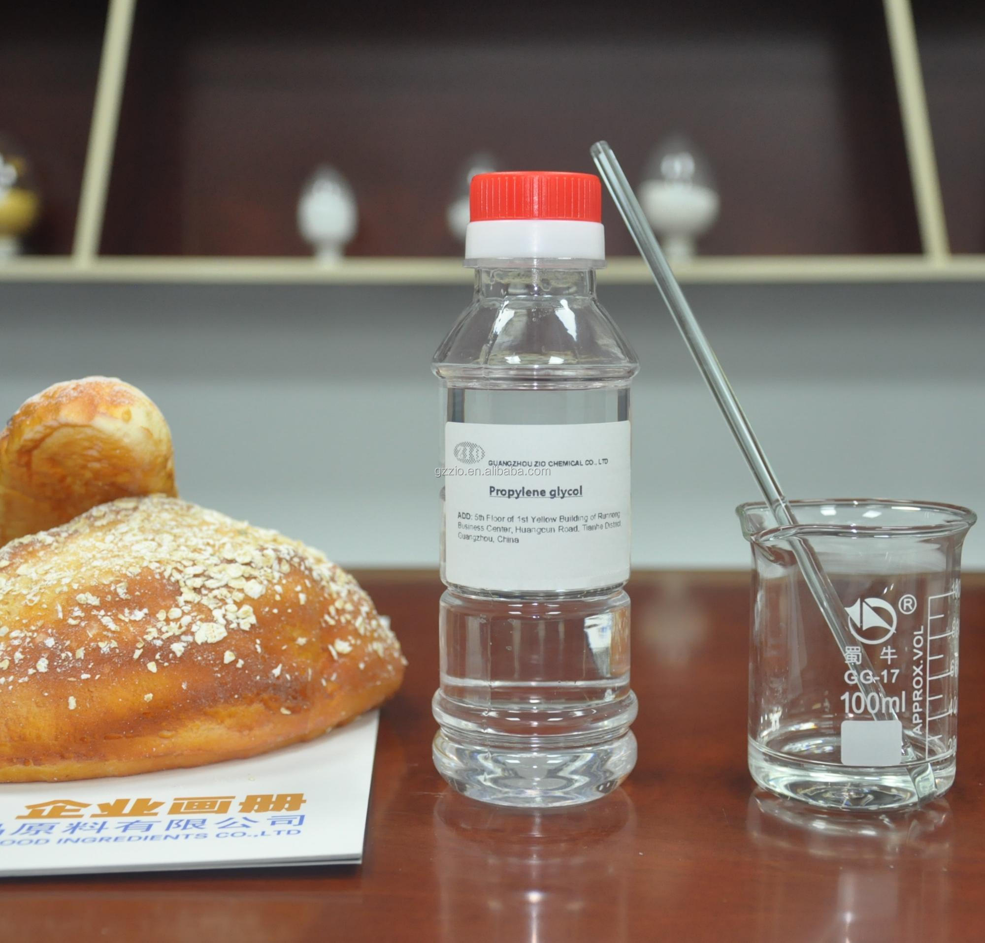 Propylene glycol is mainly used as a solvent for various flavors, pigments, preservatives, vanilla beans, roasted coffee grains, and natural flavors. Humectants and softeners such as confectionery, bread, packaged meats and cheeses. It can also be used as an anti-mold additive for noodles and stuffing cores. Adding 0.006% in soy milk can make the flavor unchanged when heated, and become white and shiny packaged tofu, and the volume expands when fried.