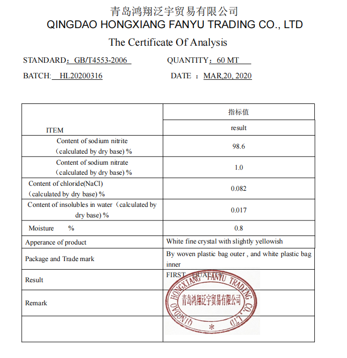 | Sodium nitrite content: | 98.6% | Insoluble content in water: | 0.017% |