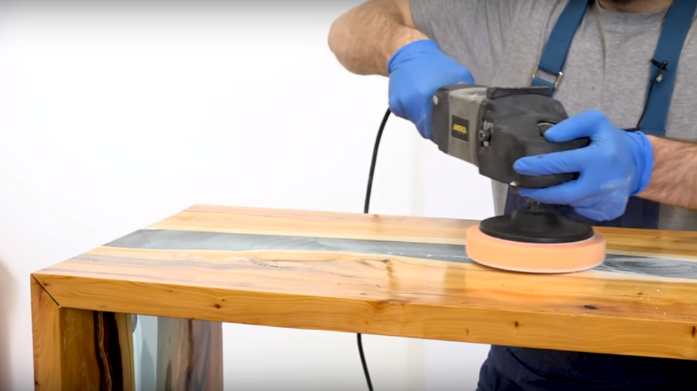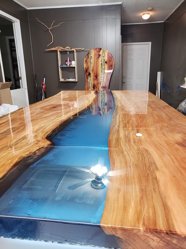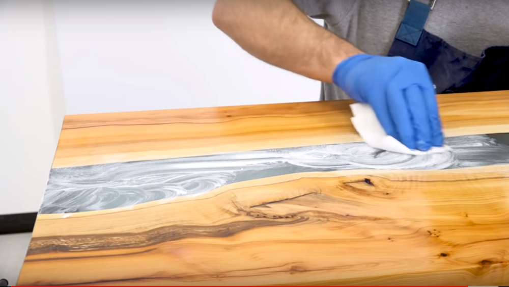 Once you've made sure your piece is level, go ahead and pour AmazingResin over your piece. do not be afraid! It will start to flatten on its own and you can roll it out into place. Let the resin flow over the edge, then finish it off with a brush. You'll notice air bubbles will start to rise to the surface. Many of these pop up on their own, but you can also pop them with a flashlight.