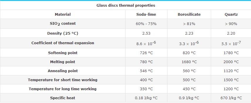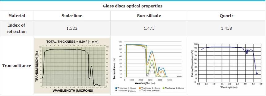 The material of the glass discs can be soda lime, borosilicate or quartz, in different sizes and applications. The difference between soda lime, borosilicate and quartz lies in the content of silica. The higher the silica content, the stronger the thermal and optical performance of the glass disc.