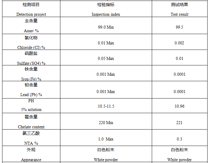 EINECS number: 205-488-0 Molecular weight: Chapter 452 EDTA properties: Not resistant to high temperatures Classification: organic sodium appearance: White crystal powder Supply capacity: 200,000 tons per year grade: Industrial grade brand: Bison port: Xingang/Qingdao Grade standards: Agricultural..... -