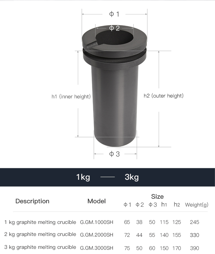 | 3KG graphite melting crucible | G.GM.3000SH | 75 | 50 | 60 | 150 | 170 | 390 |
