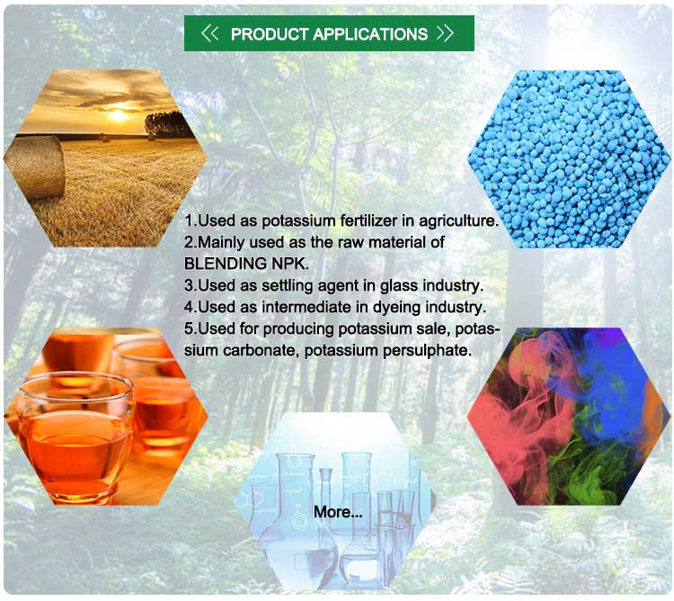 model: 99% Origin: Hebei china Classification: potash fertilizer Post type: Fast Supply capacity: 20000 tons per month IF: University College London purity: 99% CAS number: 7447-40-7 Packaging Details: 25kg/40kg/50kg/bag payment terms: L/C, Western Union, T/T state: granular port: Xingang or......