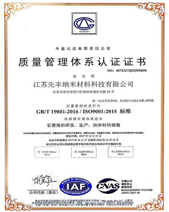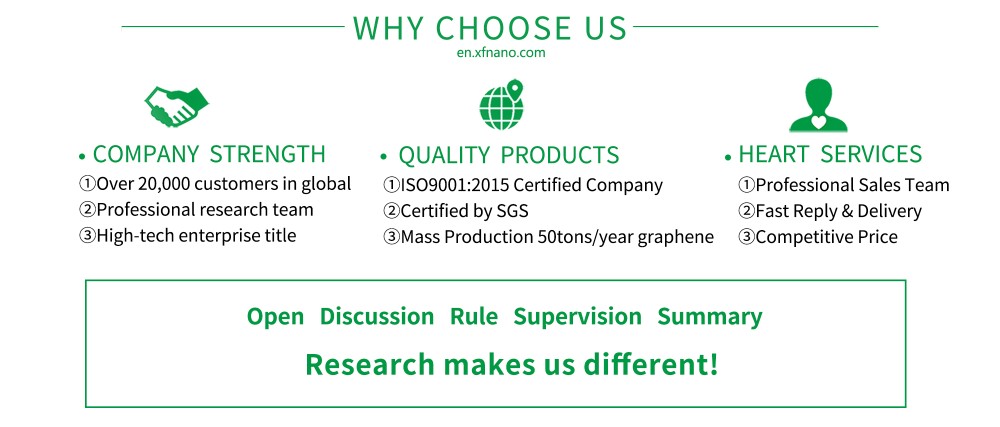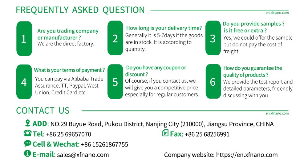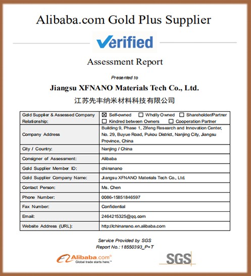 JayJiangsu Xinfang Nano Material Technology Co., Ltd. (XFNANO), established in 2009, is the earliest graphene company in the world, mainly focusing on the R&D and manufacturing of graphene, graphite, fullerene, carbon nanotubes, molecular sieves, etc. The annual production capacity of graphene powder is 50 tons, and the annual production capacity of graphene dispersion is 1,000 tons. We have passed ISO9001 certification and SGS certification. We export to all over the world, we sincerely welcome your cooperation and look forward to establishing business relationship with you.