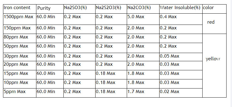 20ppm 30ppm 80ppm 150ppm 300ppm project quality index Test results Test results appearance Yellow or red flakes red flakes Yellow flake Sodium sulfide (Na2S), % 60 minutes 60.75 60.18 Iron (Fe), % 0.0300 max 0.0158 0.0018 Sodium sulfite (Na2SO3), % 1.0 max 0.19 0.35 Sodium thiosulfate (Na2S2O3), %..... -