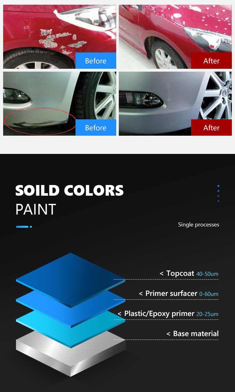 C. Complete range of products: Economical series to meet different market needs, we have a complete product line, including 2K solid color, 1K metal primer, HS&MS clear coat, hardener, primer, thinner, degreaser, adhesive, filler and sealer, putty, etc. ...