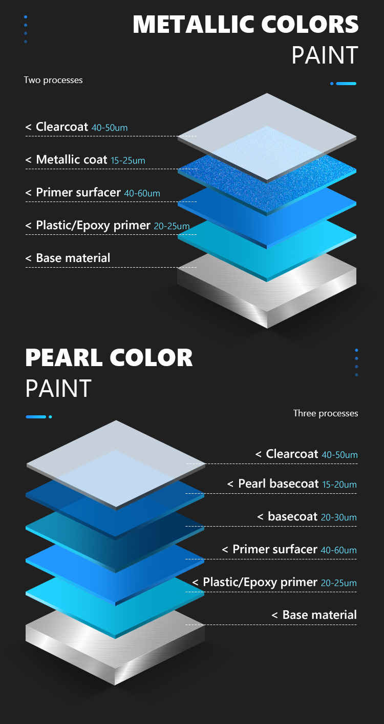 notes: 1: If the existing finish is not compatible, a 2K primer surfacer should be used as a sealer Apply one coat before primer, otherwise lift, Peeling, blistering, water immersion, etc. " 2: When the temperature exceeds 30°C or the humidity is high, it is recommended to use Retarder solvents to avoid defects. 3: Due to the high transparency of the metal primer, the secondary primer should be The color is consistent, smooth and free of sand marks, particles, and unevenness. Prevent spot defects, poor metal effects, etc. " 4: In order to avoid the problem of spots or poor adhesion, the metallic paint film should not Thickness greater than 25um. 5: If the excess silver powder is removed with a tack, the effect will be better Wipe towel after each coat. China factory sale of car paint headlight repair kit car refinish paint exported to the world anti-ultraviolet make efficient