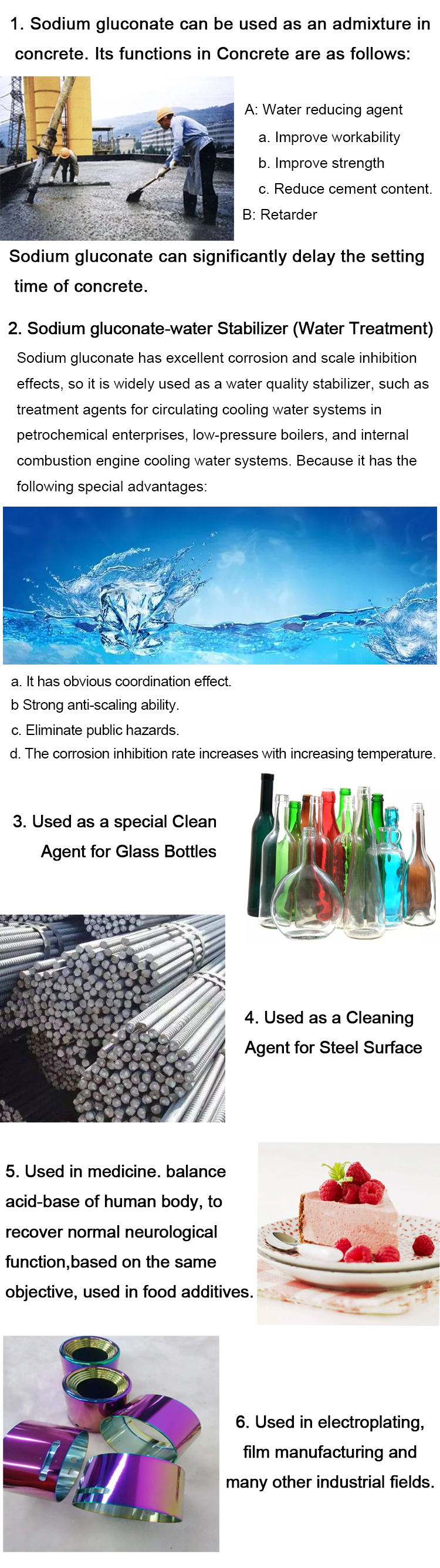 | application | Medicine, food additives, construction, textile printing and dyeing, metal surface treatment and water treatment as high-efficiency chelating agent, steel surface cleaning agent, glass bottle cleaning agent, aluminum oxide coloring in electroplating industry, high-efficiency retarder and high-efficiency reducing agent in concrete industry Water agent, etc. |