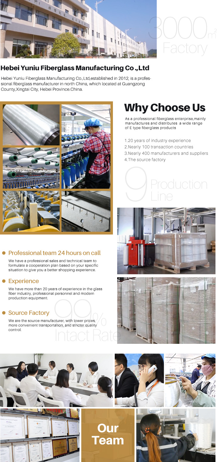 Hebei Yuniu Glass Fiber Manufacturing Co., Ltd., established in 2012, is a professional glass fiber manufacturer in North China, located in Guangzong County, Xingtai City, Hebei Province. As a professional glass fiber enterprise, it mainly produces and sells E-type glass fiber products, such as glass fiber roving, glass fiber chopped strand, glass fiber chopped strand mat, glass fiber roving, needle felt, glass fiber cloth, etc. ,Has many uses. Combination of various pipes and insulation materials in the emerging fields of environmental protection such as construction industry, automobile industry, aircraft and ship manufacturing, chemical industry, electronics and electrical, sports and leisure, and wind energy. The product is compatible with various resins such as EP/UP/VE/PA.
