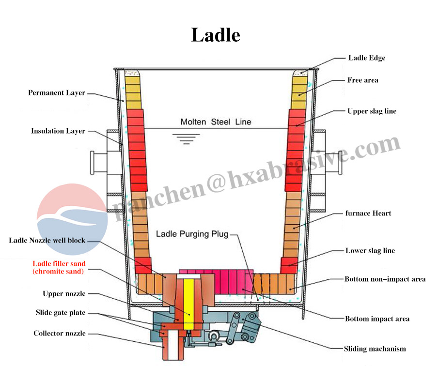 l In steel production, chromite sand is also used as filler to protect the sliding nozzle of large ladles.