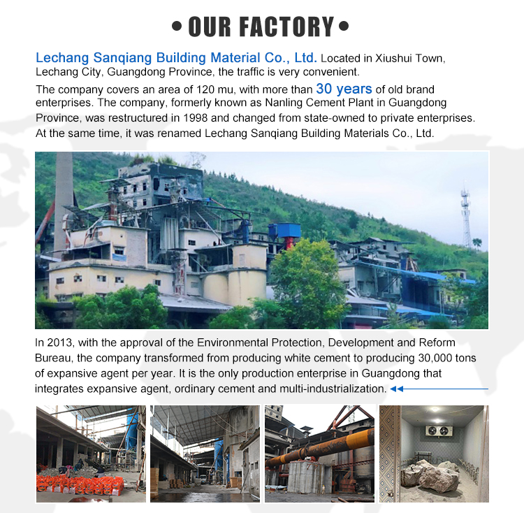type: expansion mortar color: grey Hardening properties: rapid hardening model: SCA-1/SCA-2/SCA-3 Other names: expansion mortar Package preview: brand: split star payment terms: L/C, Western Union, T/T, MoneyGram Package: bag/carton/wooden pallet Material: Calcium Oxide Feedback: All customers give.... -