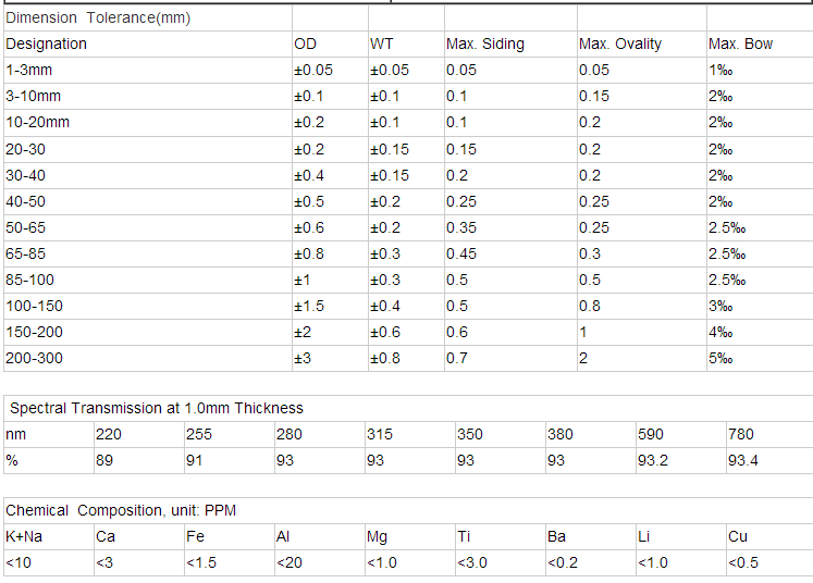 model: TJ-00085 Silica composition: >99.99% density: 2.2 g/cm3 Outer diameter: 2-500 purity: 99.99% Place of origin: Jiangsu, China Softening Point: 1680℃ Transmittance: 90% Annealing point: 1210℃ Strain point: 1120℃ port: Shanghai Port, Lianyungang Port, Suzhou Port, Rizhao Port, Qingdao Port...... -