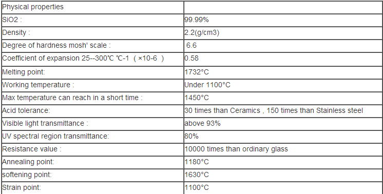 Product Description Quartz properties:Chemical properties:Quartz glass is an acidic material. It is inert to any other acid except hydrofluoric acid and hot phosphoric acid. It is a very good acid-resistant material and has better chemical stability than opaque quartz glass. It does not absorb...... -