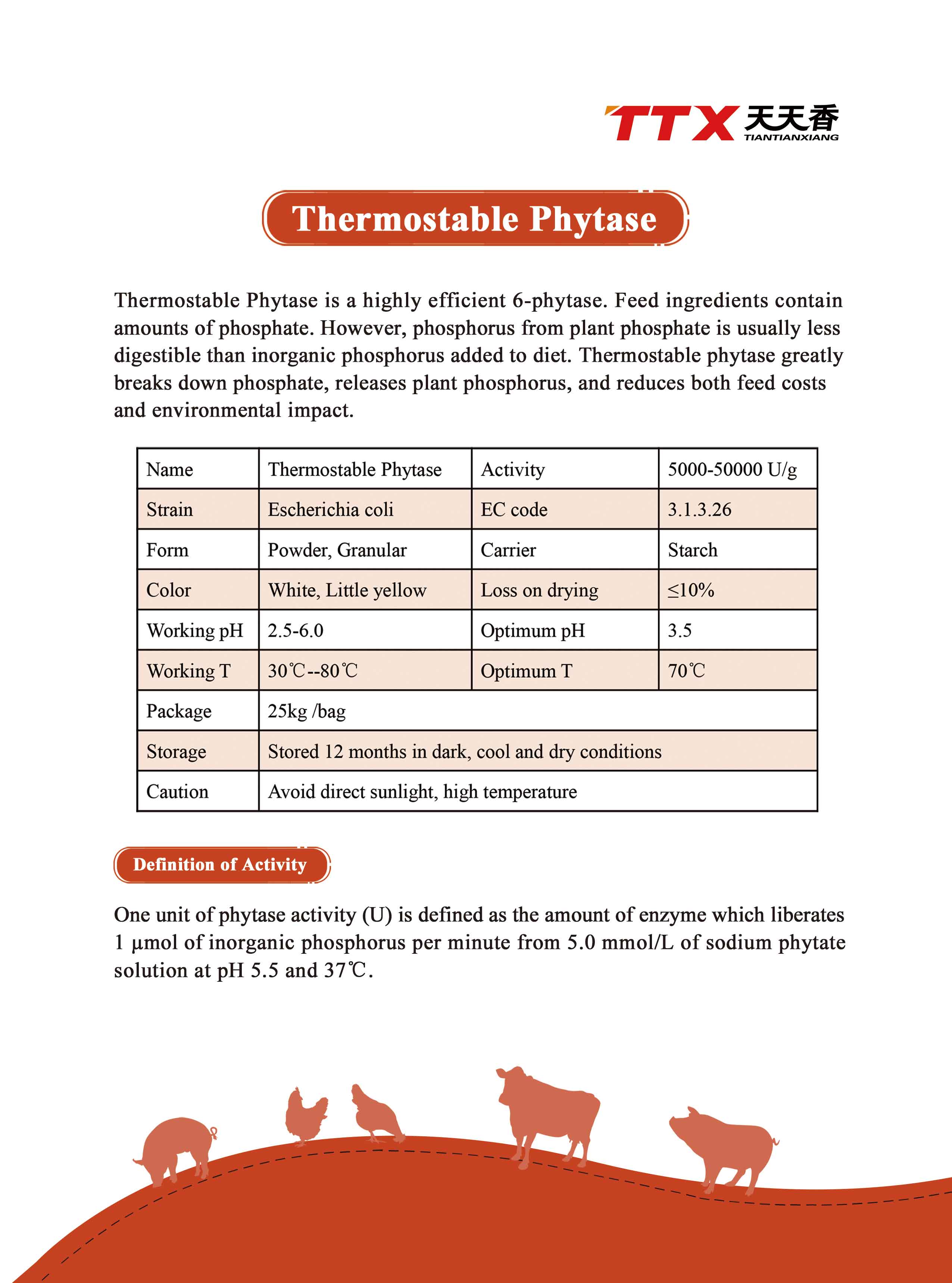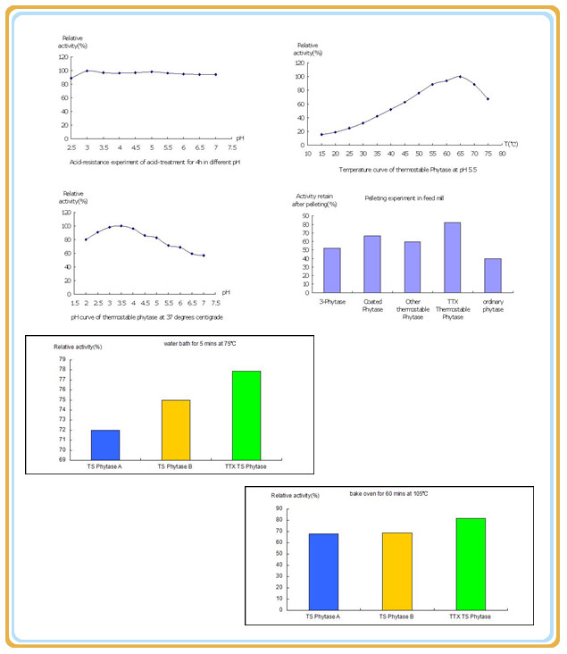 Thermostable phytase is a highly efficient 6-phytase. Feed ingredients contain large amounts of phosphates. However, the phosphorus in plant phosphates is generally more difficult to digest than the inorganic phosphorus added to the diet. TTX thermostable phytase can significantly break down phosphate, releasing plant phosphorus, reducing feed costs and environmental impact.