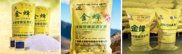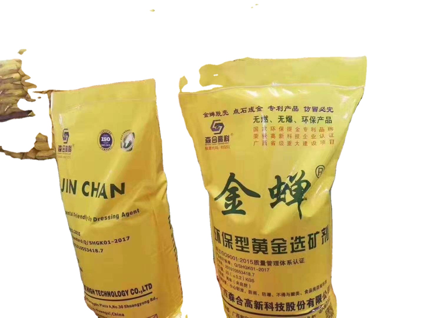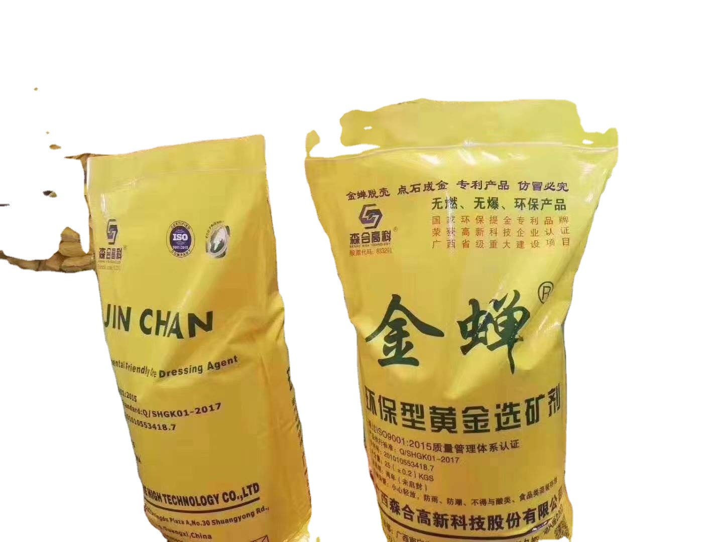 Jinchan environmentally friendly gold dressing agent is a new high-tech product independently developed by Guangxi Senhe High-tech Co., Ltd. to replace sodium cyanide for gold dressing. At present, Jinchan dressing agent is the only product in the world that has obtained the "environmentally friendly gold extraction" patent. This product does not require changes to the original process and can directly replace sodium cyanide for gold production.