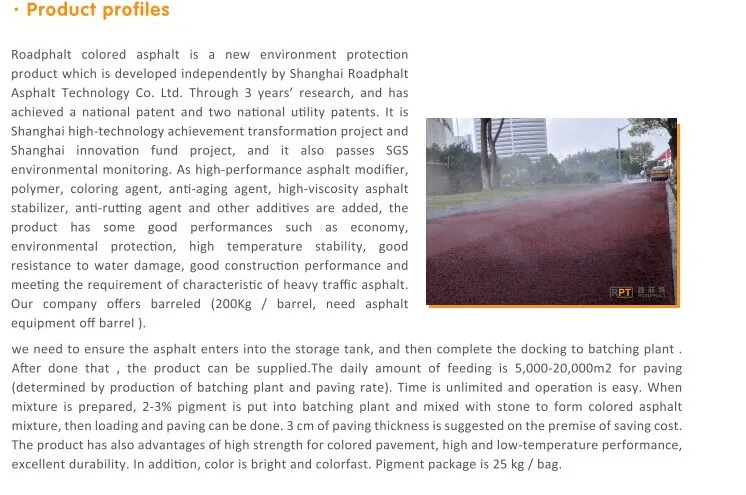 We provide professional service for every buyer. Whatever your colored modified asphalt needs, we have the materials and the expertise to get the job done.If you have any questions, please do not hesitate to contact us, we would like to provide you with more information about our products, we are here...just for you.