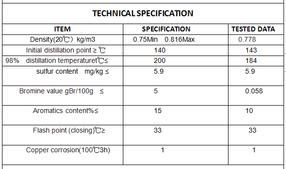 Appearance is water-white liquid, composed of petroleum distillates at 140°C-200°C. It has an appropriate volatilization speed, often contains a certain amount of aromatic hydrocarbons, and has strong solubility in dry oils and resins. Appropriate distillation range and volatility, good solubility for some oily and magnetic coatings; low bromine value, low unsaturated hydrocarbon content, good stability; high flash point, high initial boiling point, can reduce toxicity and fire hazards, Good for safety; colorless white, low mercaptan sulfur content, good refining depth.
