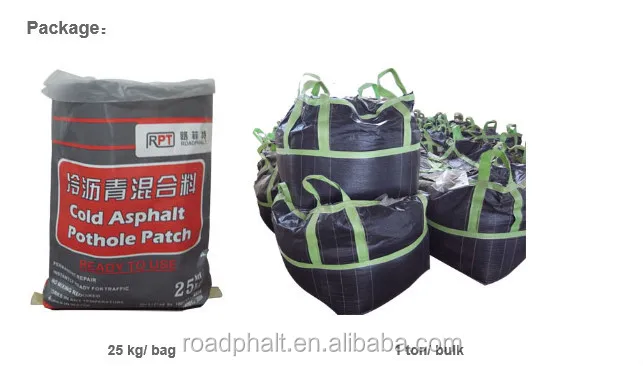 Roadphalt All Weather Cold Lay MaterialIt is a high-tech pavement repair material. It is made of Roadphalt high-performance cold paving additive, asphalt and aggregate according to a certain processing technology. The appearance is black granular solid with a slight petroleum smell. Static insensitive, stable performance.