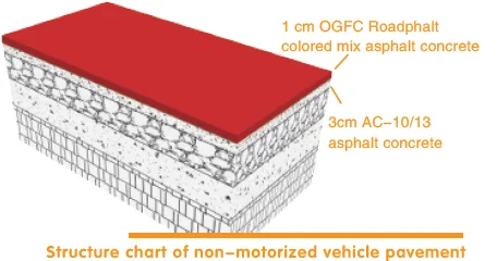 The Roadphalt Colored Cold Mix Asphalt Concrete Surface System is an efficient construction solution. Rapid prototyping of road-use colored cold modified asphalt mixture using paving equipment. The system adopts a unique OGFC-5 open gradation skeleton void structure, and the pavement porosity can reach more than 12%. The molding thickness is 0.7-1.5cm.