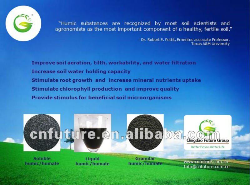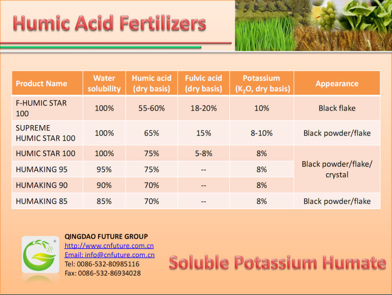 | pH: | 9-11 | Water solubility: | Fully water soluble potassium humate |